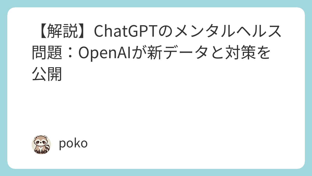 OpenAIは最近、ChatGPT利用者のメンタルヘルスに関する新たなデータを公開した。潜在的な自殺計画や精神的な問題を抱えるユーザーが多数存在し、AIチャットボットに相談する実態が明らかになった。これに対し、同社は170名以上の専門家と協力し、AIの応答改善や新たな評価指標の導入を進めている。しかし、AIチャットボットによる精神的悪影響を巡る訴訟問題も浮上しており、AIの安全性と倫理的な課題が浮き彫りになっている。