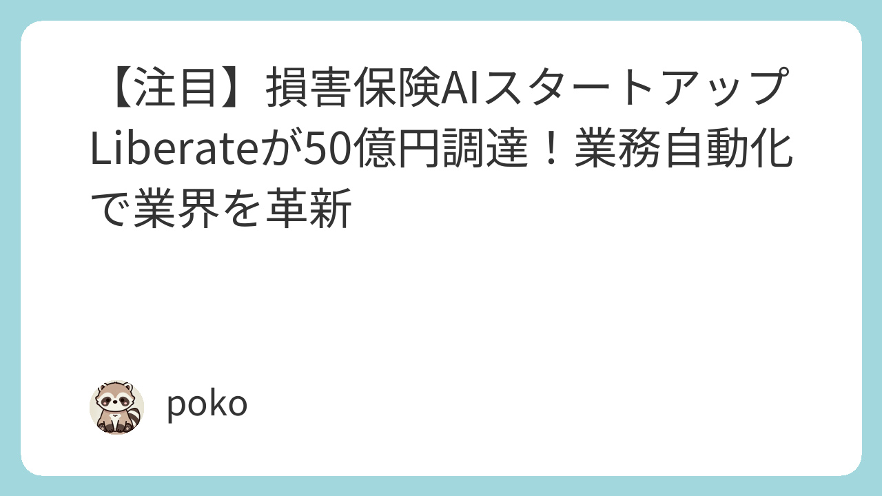 【注目】損害保険AIスタートアップLiberateが50億円調達し、評価額は3億ドルに到達。保険業界の運用コスト増加やレガシーシステムといった課題に対し、同社はAIによる業務自動化を推進。バックオフィスから顧客対応、さらには損害保険金請求プロセスの効率化に至るまで、AIエージェントが保険業務を変革し、業界全体の生産性と顧客体験の向上に貢献すると期待される。