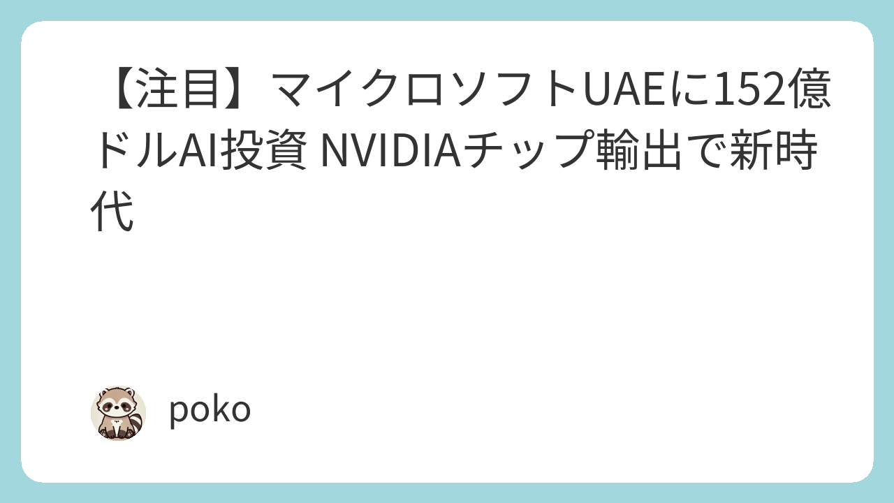 マイクロソフトはアラブ首長国連邦(UAE)へ今後4年間で152億ドルの巨額AI投資を行うと発表しました。これは米国がNVIDIA製先進AIチップのUAEへの輸出ライセンスを初めて付与したことを含み、米国のAI外交戦略の重要な一環と位置付けられています。中東におけるAI競争が激化する中、UAEは米国のAI影響力を拡大するための戦略的拠点となる見込みです。単なるインフラ投資にとどまらず、地元人材育成や研究開発ハブとしての貢献も期待されています。