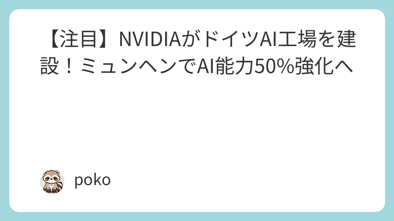 NVIDIAとDeutsche Telekomは、ドイツ・ミュンヘンに大規模なAIファクトリーを建設すると発表した。この提携は10億ユーロ規模に及び、ドイツのAIコンピューティング能力を50%強化することを目指す。データ主権を尊重しつつ、国内企業向けにAI推論などのサービスを提供。欧州のデジタル戦略を支え、域内のAIインフラ強化に貢献する。