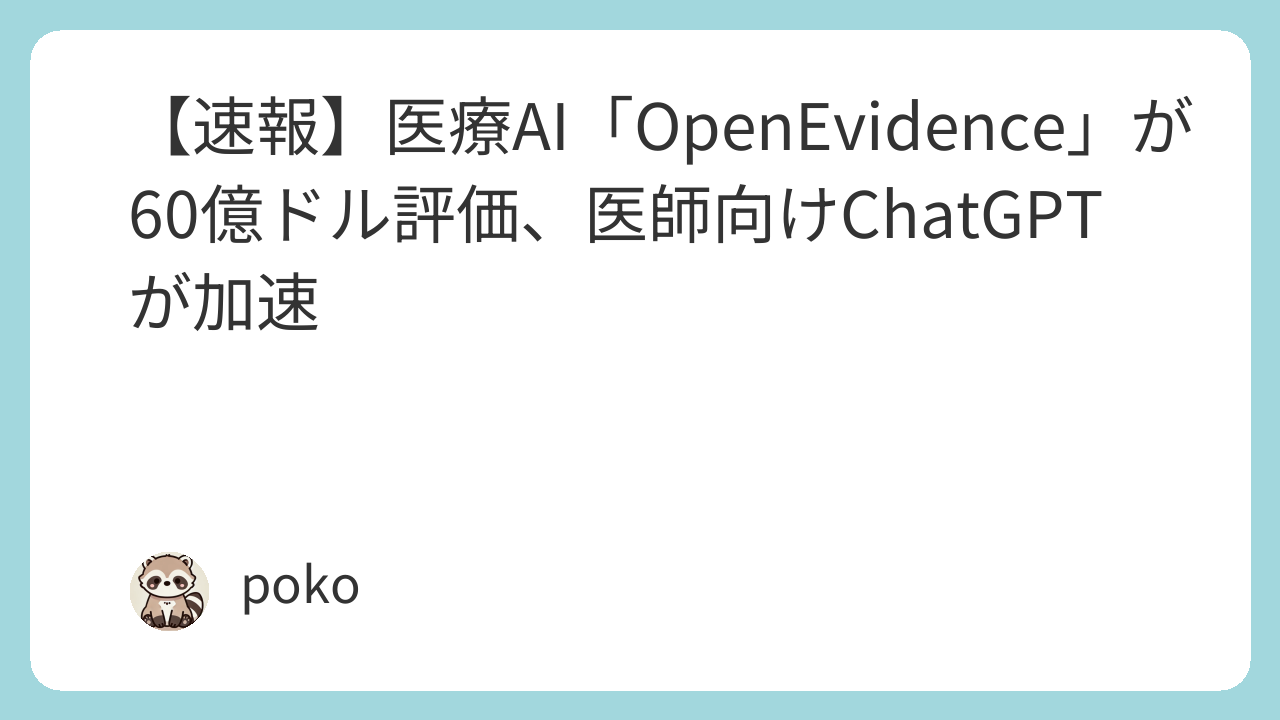 医療AI「OpenEvidence」が、医師や看護師から「医療版ChatGPT」と称され、評価額60億ドルで2億ドルの大型資金調達を計画していると報じられました。わずか3ヶ月で評価額が急上昇しており、業界特化型AIへの投資家の強い関心が伺えます。JAMAなどの医学論文で訓練されたこのツールは、医療従事者へ無償で情報を提供し、月間1500万件の診療相談を処理するまでに急成長しています。