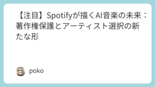 AI 【注目】Spotifyが描くAI音楽の未来:著作権保護とアーティスト選択の新たな形 Spotifyが大手音楽レーベルと提携し、AI音楽製品の開発を発表。著作権を尊重し、アーティストがAIツールの利用を選択できる「責任あるAI」を推進。AI生成音楽を巡る過去の課題を克服し、音楽業界におけるAIの健全な未来を構築するSpotifyの新たな挑戦とは。 2025.10.17 AI