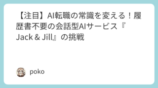 AI 【注目】AI転職の常識を変える!履歴書不要の会話型AIサービス『Jack & Jill』の挑戦 終わらない転職活動に終止符を。AIによる大量応募や非効率なマッチングが課題となる中、会話型AIを活用した履歴書不要のHRテックサービス『Jack & Jill』が注目されている。2000万ドルの資金調達を経て、求職者と企業双方に革新的なAI転職体験を提供する次世代プラットフォームの全貌。 2025.10.17 AI