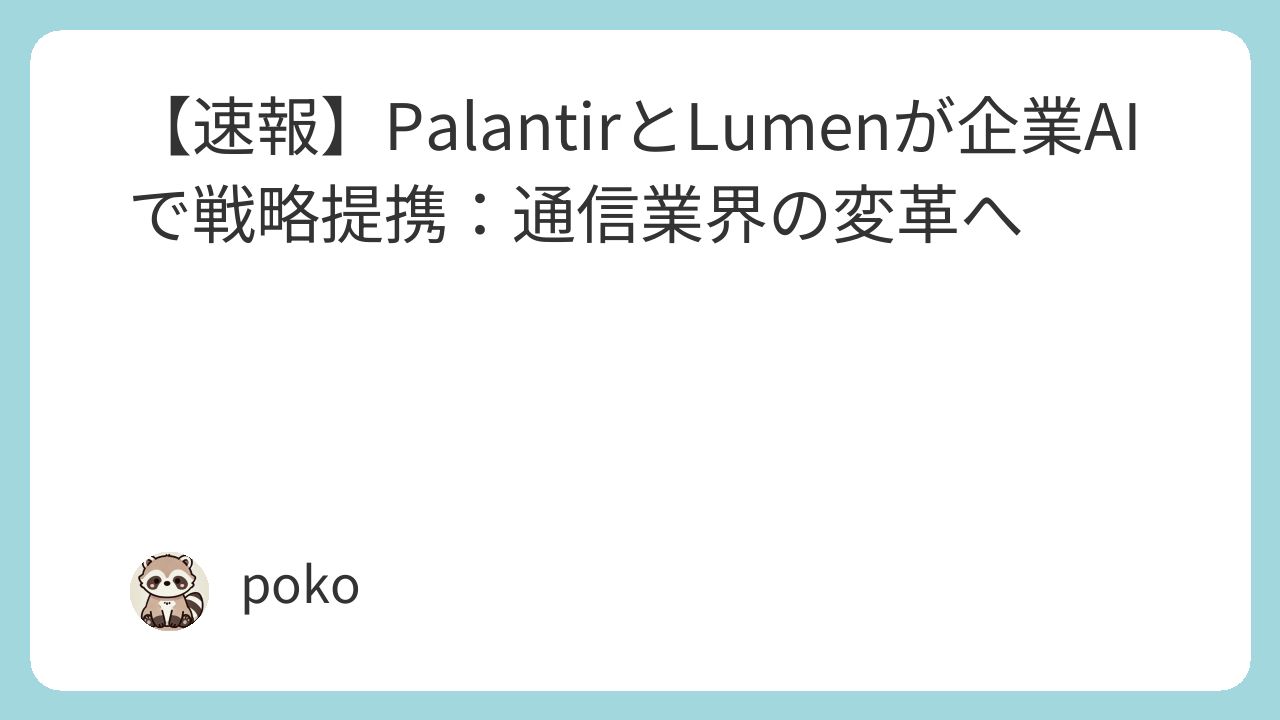 Palantir TechnologiesとLumen Technologiesが、数年間で数億ドル規模の戦略的提携を発表しました。LumenはPalantirのAIソフトウェアを導入し、通信業界向けの企業AIサービスを構築します。この提携は、Lumenが従来の通信事業者から現代的なテクノロジーインフラ企業へ変革を目指す中で重要な位置付けです。両社はデータ管理AIを通じて、通信会社向けデータ管理AIやエッジコンピューティングを活用した新サービスを展開し、企業AIが通信業界に新たな価値をもたらすことを目指します。