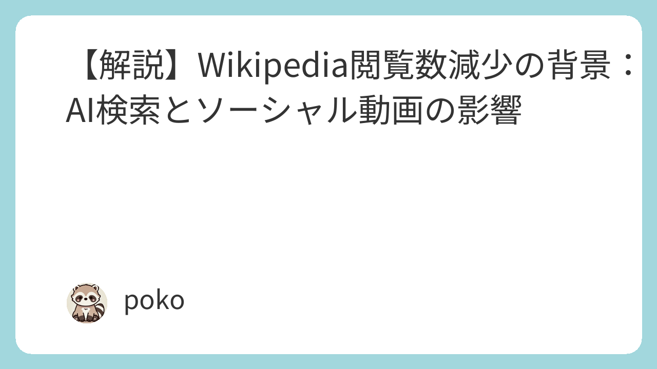 Wikipediaの人間によるページビューが前年比で8%減少しました。この現象は、ボット検知システム更新後に、過去の「高トラフィック」の多くが検知回避ボットによるものと判明したことで明らかになりました。主な原因はAI検索の影響とソーシャル動画による情報収集の変化とみられています。この閲覧数減少は、ボランティアや寄付者の減少につながる可能性があり、Wikipediaはコンテンツ利用企業への働きかけや、新しい読者層へのアプローチを強化しています。